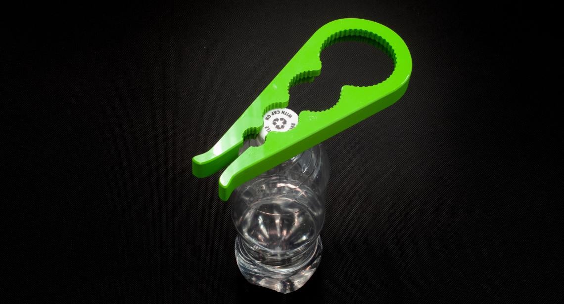 Bottle opener can be attached to the bottle cap of a standard water or soda bottle to easily twist off and on.